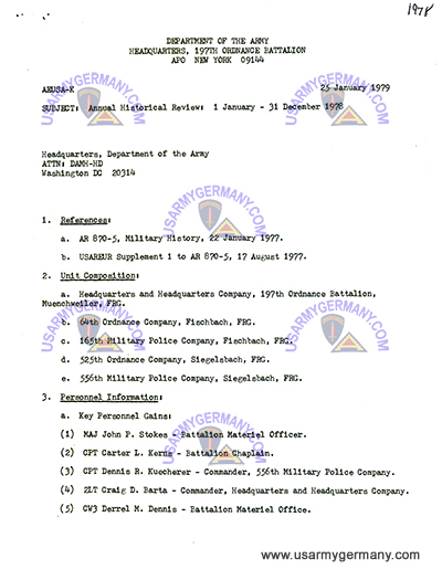 The headquarters was located at the old hospital in Munchweiler. Units assigned to the battalion were the 525th Ord Co / 556th MP Co located at Siegelsbach the 64th Ord Co. / 165th MP Co at Fischbach.