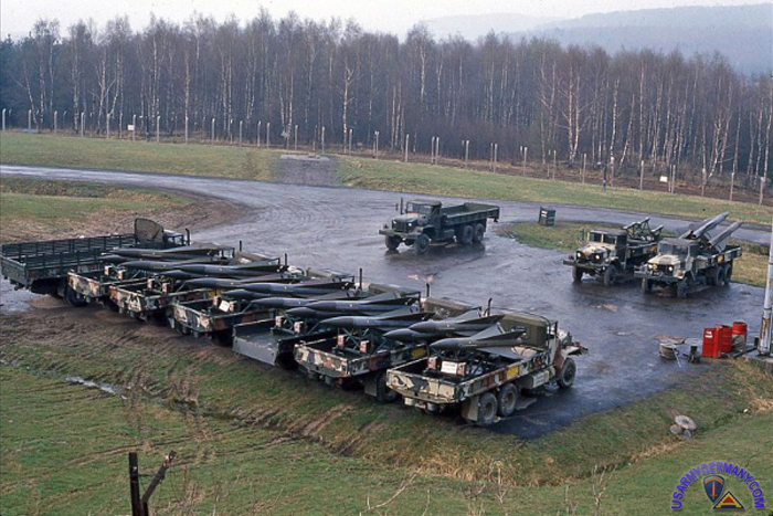 View of the storage area on site. 2½-ton trucks with HAWK missiles ("reloads") are ready for deployment to the field.