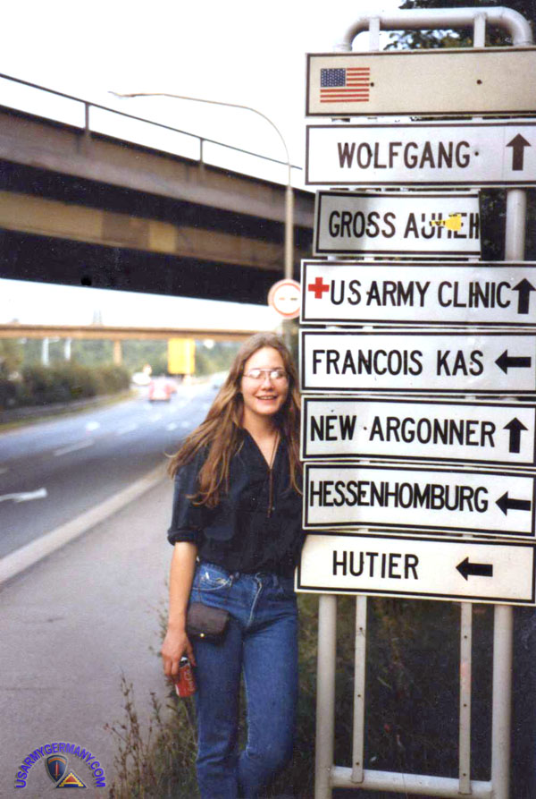 Barbara stands next to signs pointing to various US installations in the Hanau area.