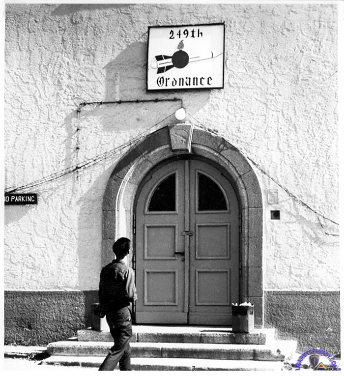 (Top) Entrance to 249th Ordnance Detachment barracks. (Bottom) Keystone above entrance dates back to 1938.