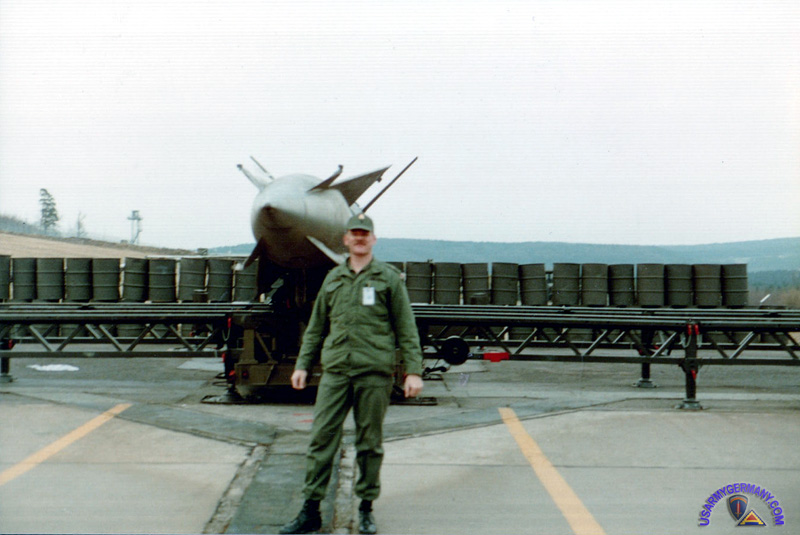 Sp 4 Mosholder stands in front of a Nike missile of C section.