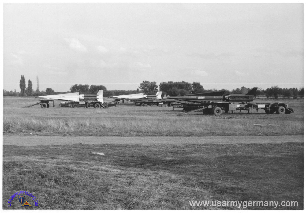 View from the left side of the same three Nike-Hercules missiles. The M529 RRTs can be seen on the near side of each launcher. The nearest missile on the right was painted black because it was the missile equipped with a M74 training warhead. The other two missiles were equipped with high explosive warheads.