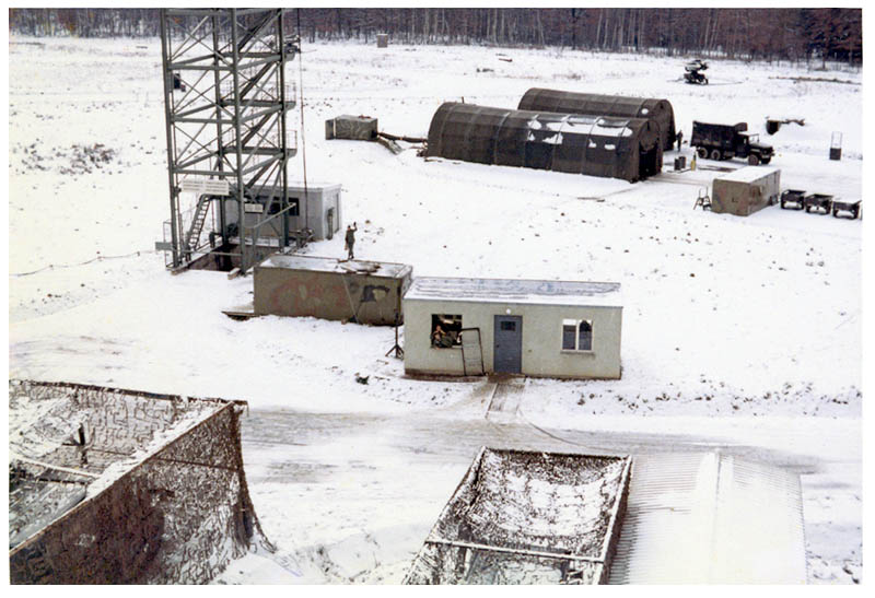 The communications shed in the center as seen from the ROR tower. The tower on the left has the Pulse Acquisition Radar mounted on top. Several launchers are visible in the back ground.