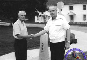 Sp3 Richard Cote and Sp3 Jim Reinecke (top) in front of unit sign; (bottom) both meet again 50 years later at Derby Line, Vermont