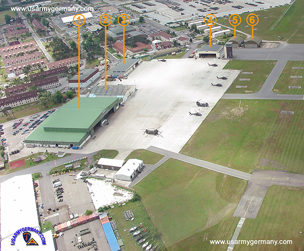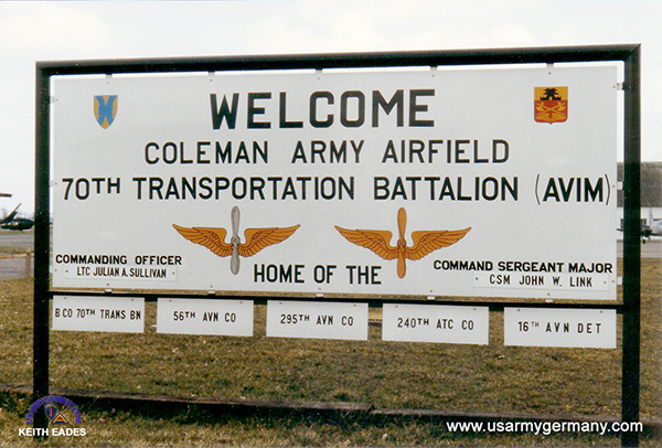 | Coleman Army Airfield is the busiest Army airfield in USAREUR. Army aircraft from units in Germany, France, Italy and from military advisory assistance groups (MAAGs) in Greece, Turkey, Iran, Pakistan, India, Ethiopia and the Congo fly into the airfield for depot-level repairs at the Army Aviation Maintenance Center (located at Coleman).