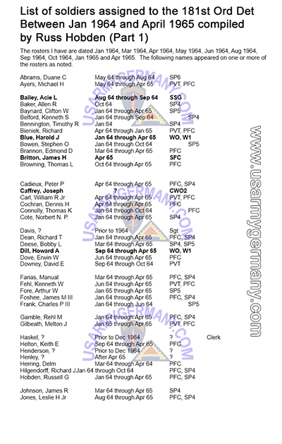 Roster for 181st Ord Det, 1964-65 (Russ Hobden) |