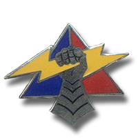 The insignia will portray the division's drive across France into Germany during World War II. A silver gauntlet is shown grasping a yellow lightning flash horizontally in front of the traditional armored triangle.