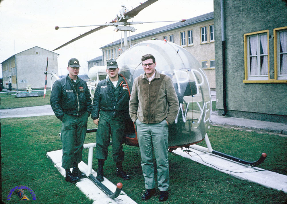 | This picture was taken in front of D Trp orderly room. The H-13 is a static display which was decorated for Christmas and New Year. The three members of D troop are from left to right: spec Gregory, spec John Heaton and spec Wayne Luce. The building set back is possibly B or C troop orderly room, I think Hdq troop orderly room was over by the mess hall. I think directly across from D toop orderly room was an S and T unit. |